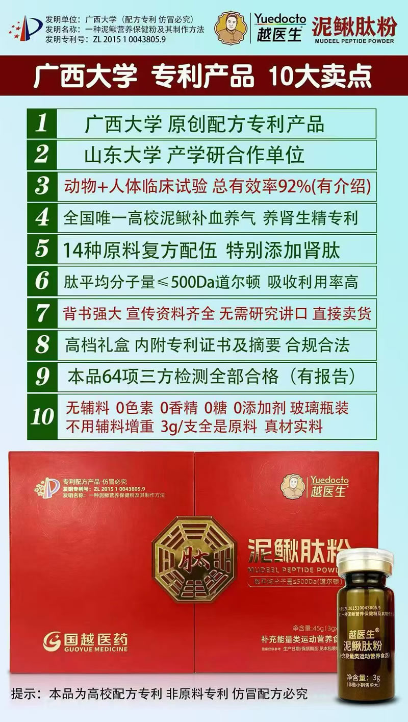 真正的好滋補,始于權(quán)威科研的加持。泥鰍肽粉依托廣西大學原創(chuàng)配方專利(專利號:ZL201510043805.9)與山東大學產(chǎn)學研合作雙重權(quán)威背書,匯聚兩大高校頂尖研發(fā)力量,突破傳統(tǒng)滋補局限,打造更科學、更高效的泥鰍肽配方。