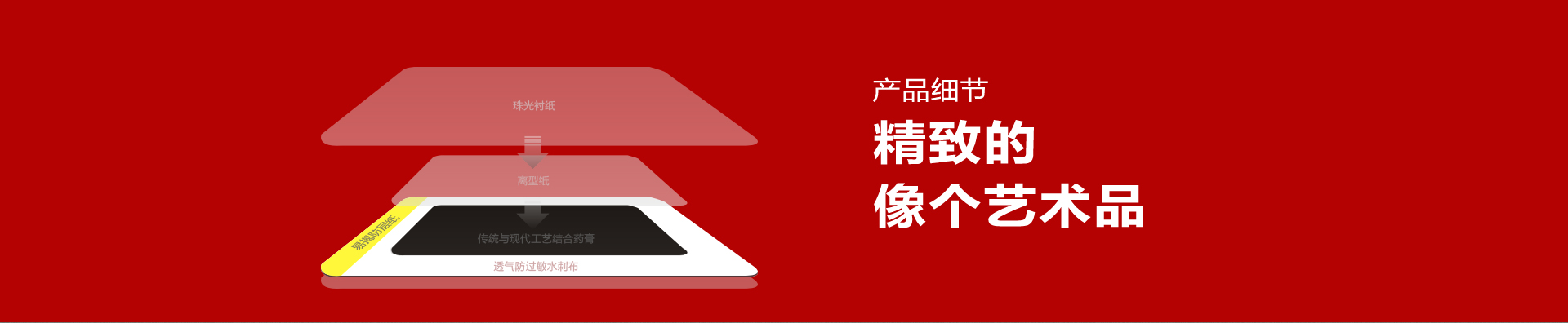 該產(chǎn)品由無紡布、熱熔膠、防粘層(硅油紙、聚丙烯膜)等部分組成。